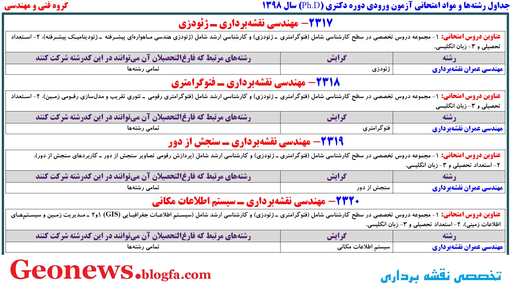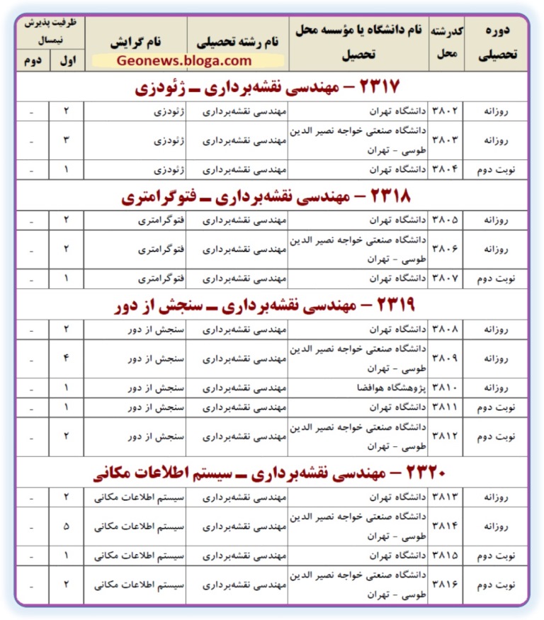 (جهت مشاهده تصویر با کیفیت بالاتر بر روی تصویر فوق کلیک نمایید). جهت مشاهده ی ظرفیت دکتری نقشه برداری مربوط به سال های قبل به لینک زیر مراجعه کنید: